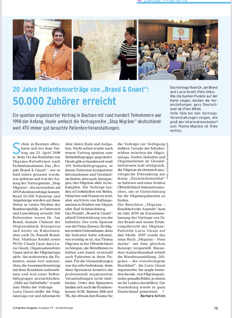50.000 Zuhörer bei Vorträgen erreicht. von Wolfgang Gnant | Juli 19, 2018 | Archiv | 0 Kommentare Sonderdruck im migräne magazin Heft 79